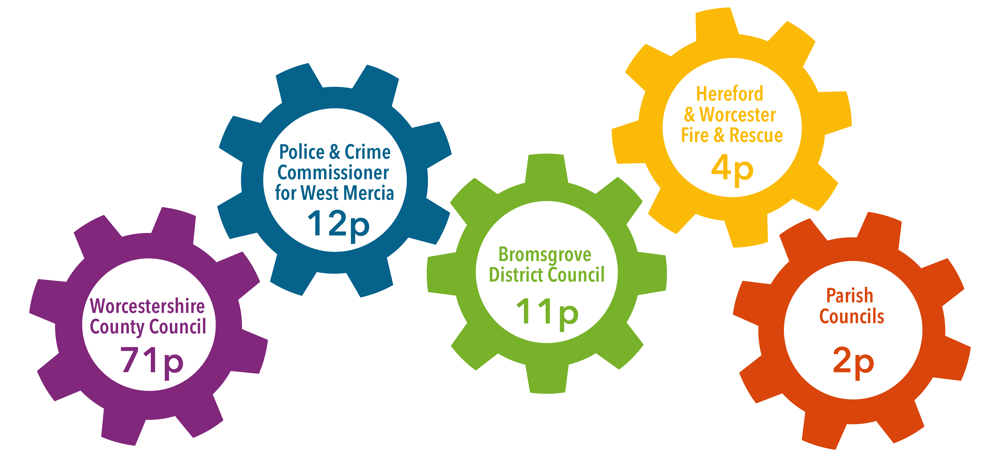 For every pound you pay broken down - (WCC - 71p, PCC - 12p, BDC - 11p, HW F&R 4p, Parish Councils - 2p